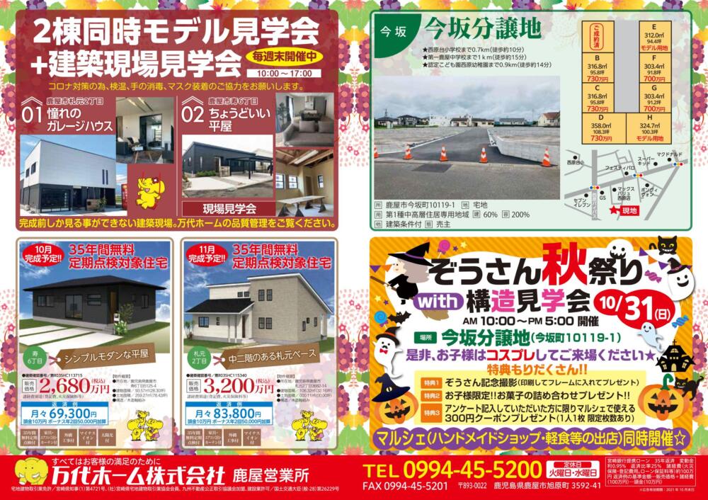 ▲上の画像をタップするとチラシをダウンロードできます 鹿屋市の情報誌『ビッグウェーブ』10月号に 万代ホームの最新情報が掲載されています! 建売住宅の特別価格や最新分譲地など、 見どころいっぱい! ぜひ一度手に取ってご覧になってみて下さい!