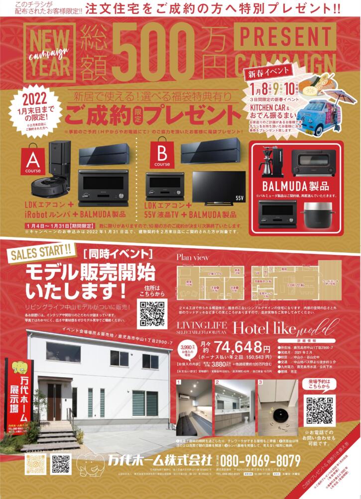 鹿児島市エリアでは、 【総額500万円プレゼント】新春キャンペーンを 開催中です! 新築をご建築の方へ スタイリッシュな人気家電を プレゼント🎁 詳しくはイベントページをご覧下さい。 来場ご予約はお気軽にどうぞ! 各エリアで開催中の見学会・相談会の ご予約はイベントページから、 ご来場の予約は各展示場のページから お気軽にどうぞ!
