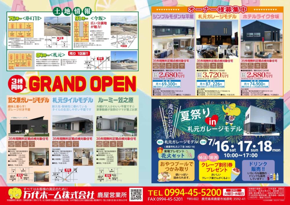 鹿屋エリアの情報誌『ビッグウェーブ』7月号に 万代ホームの最新情報が掲載されています 最新モデルハウスや分譲地、イベント情報など、 見どころいっぱい! ぜひ一度手に取ってご覧になってみて下さい! tel:0994-45-5200 各エリアで開催中の見学会・相談会の ご予約はイベントページから、 ご来場の予約は各展示場のページから お気軽にどうぞ!