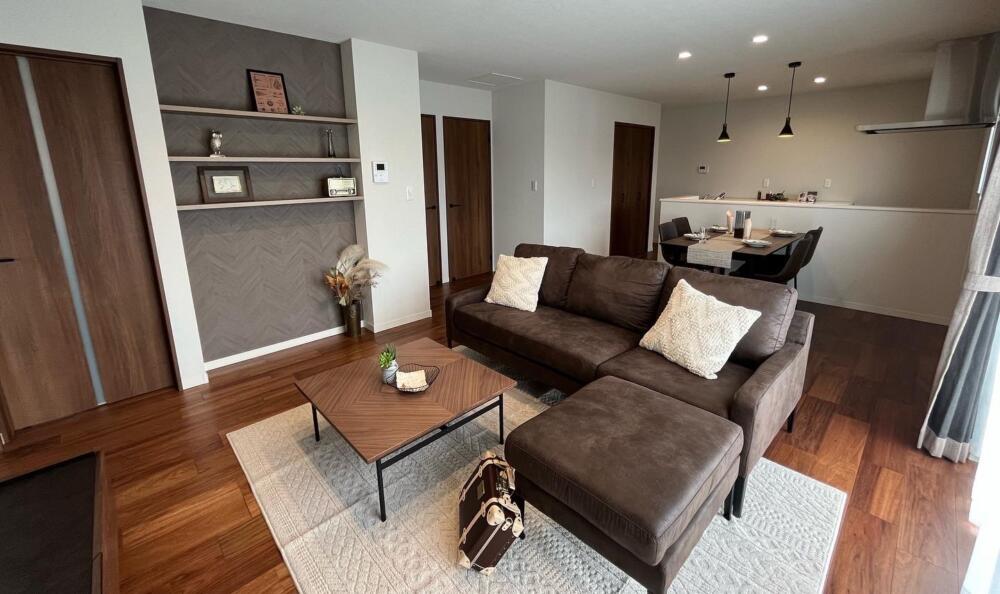 約19帖のリビングです。落ち着いたシックなインテリアとなっています。