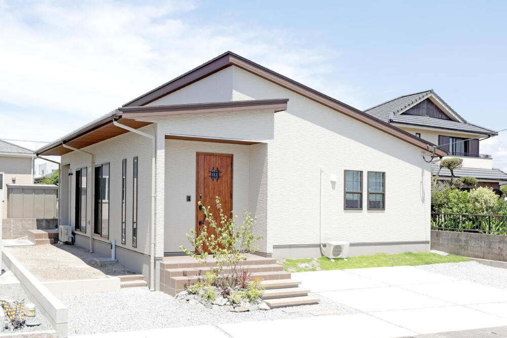 白の外壁と格子付きの窓が可愛らしい明るい雰囲気の平屋ハウス。