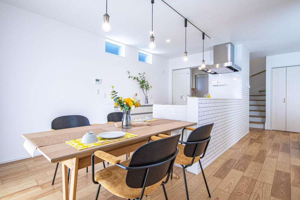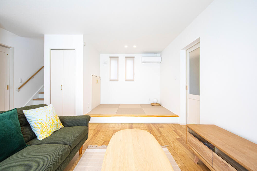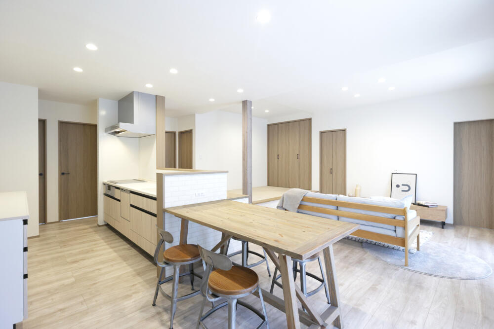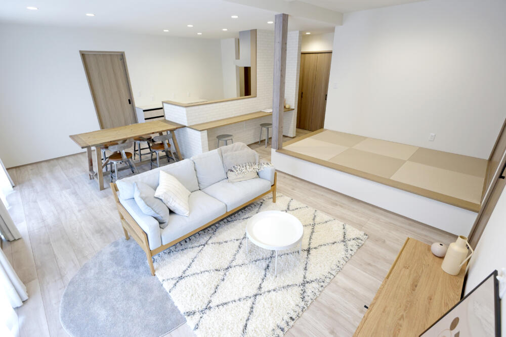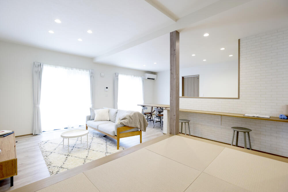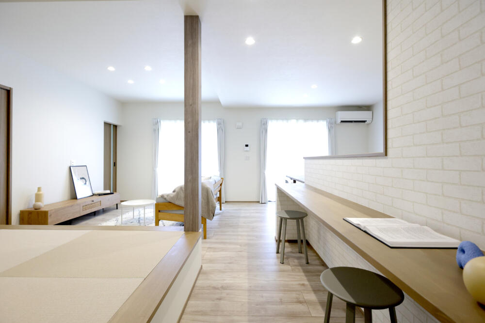 20帖あるLDKは小上がりのタタミスペースと隣接しており、リビングの天井高を上げているので明るく解放感のある空間になっています。またカウンターテーブルもあり、子供の勉強スペースや家事のスペースとしてフレキシブルに活用できます。