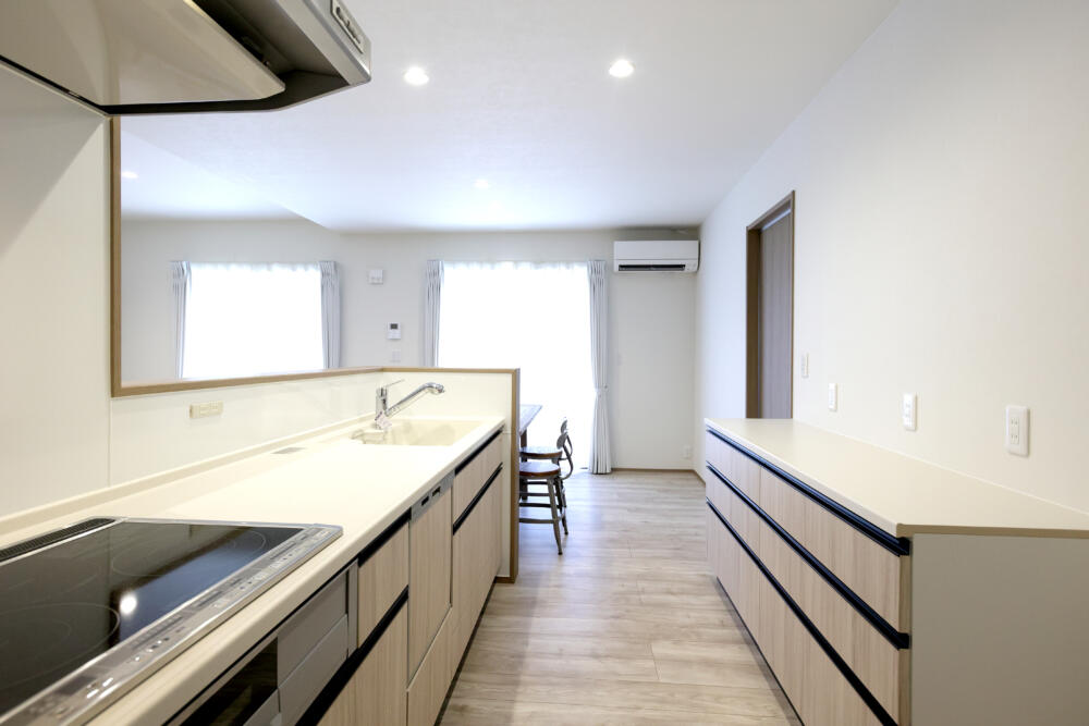 キッチンは脱衣室、ウッドデッキと隣接していてキッチンに立ちながらもお洗濯もこなせます。脱衣室はキッチン側からもリビング側からも出入りができますので、家事動線と生活動線がかぶりらず家事に追われているときもストレスフリーです。