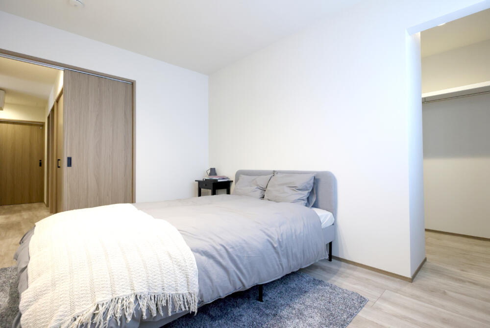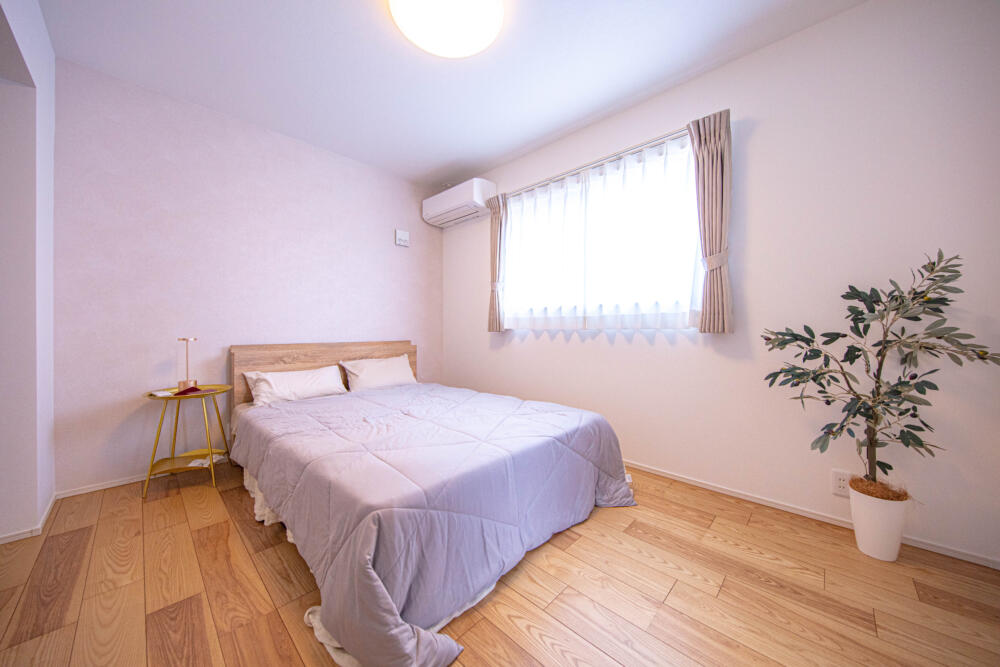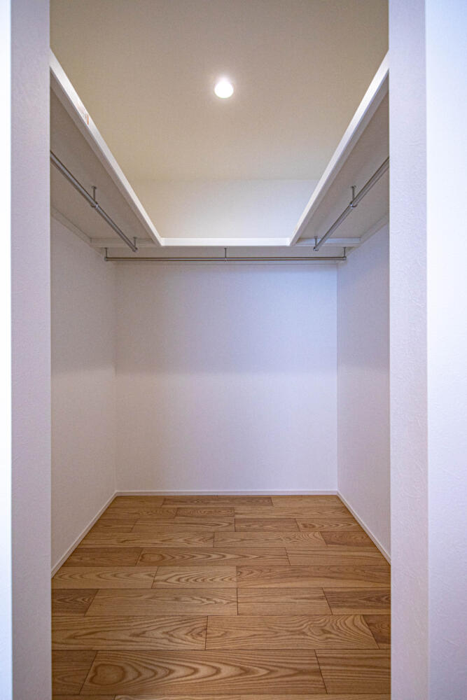 バルコニーとウォークインクローゼットと隣接した寝室。お洗濯物干場としてウッドデッキだけでなくバルコニーも完備しています。そのまま洋服はそのままウォークインクローゼットにかければ畳む時間を短縮ができます。