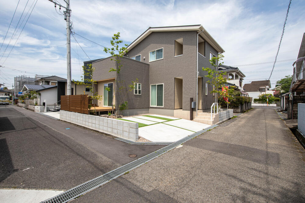 寄棟屋根とホワイトのサッシ枠で落ち着きつつも可愛らしい外観。日当りの良い南側い洗濯物干し場に最適なウッドデッキもあります。脱衣室→キッチン→ウッドデッキへと動線が繋がっていて、お洗濯の負担を軽減します。