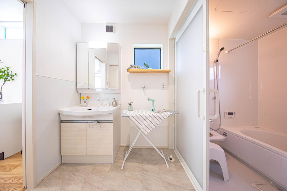 キッチン裏から脱衣室に繋がります。脱衣室には勝手口があり南側のタイルデッキにそのまま洗濯物を干すことができます。