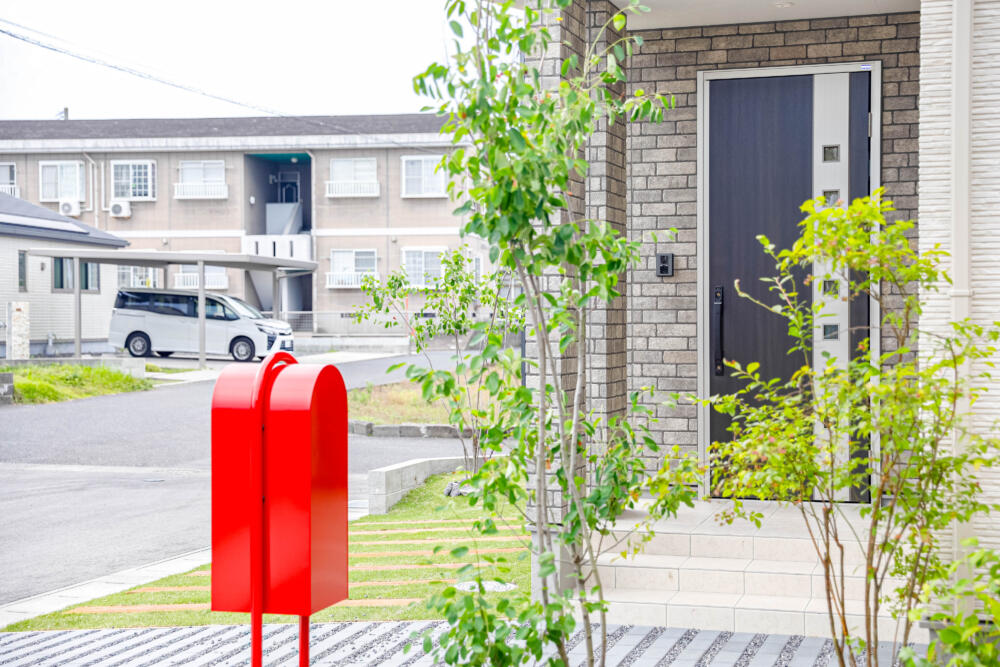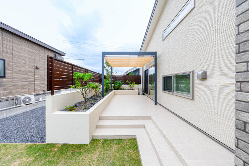 タイル調の外壁の張り分けがオシャレな外観と緑にこだわったエクステリア。素敵なエクステリアは住宅をますます引き立ててくれます。