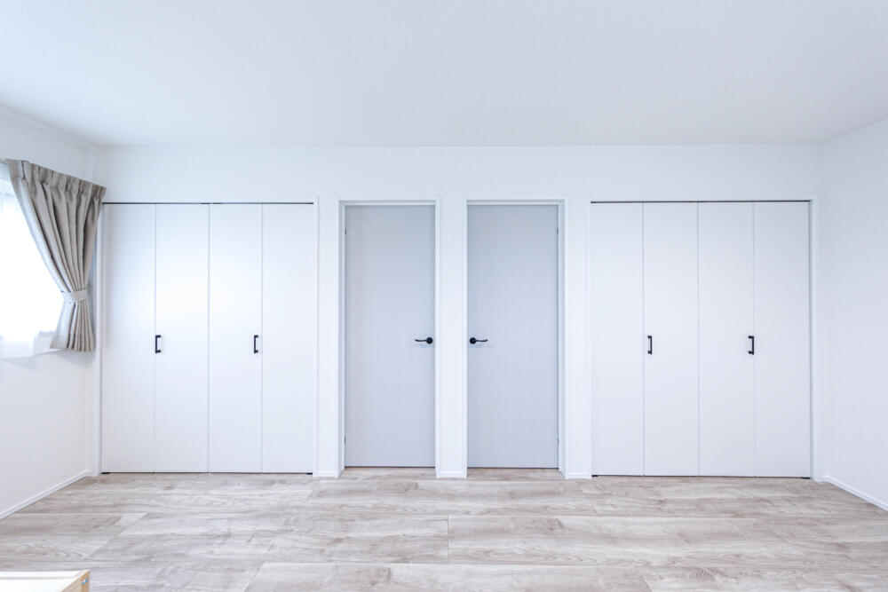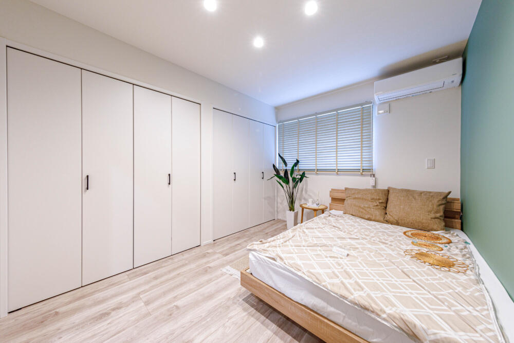爽やかな雰囲気の寝室。大容量のクローゼットが2つあるのでご主人様用、奥様用分けて収納できて便利です。