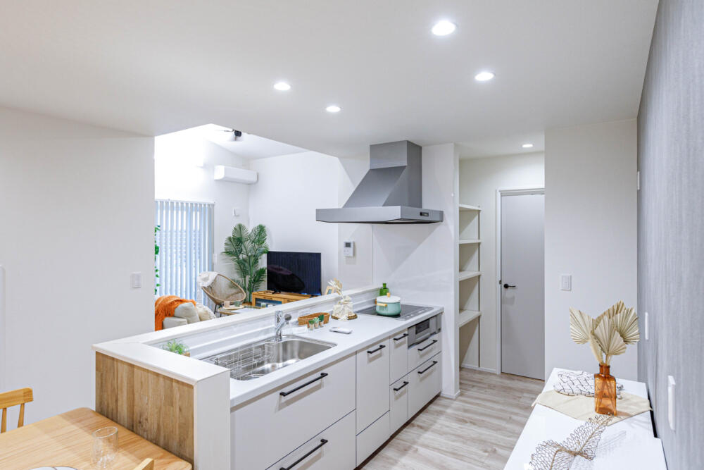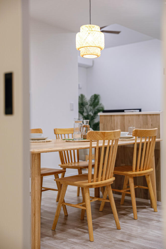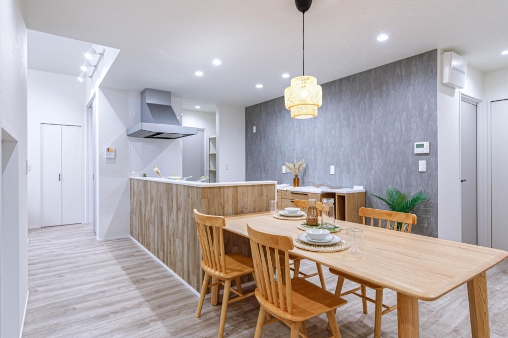 ぐるっと回れるキッチンダイニングスペース。ダイニングテーブルとキッチンが横並びになる動線で食事の準備がラクラクです。