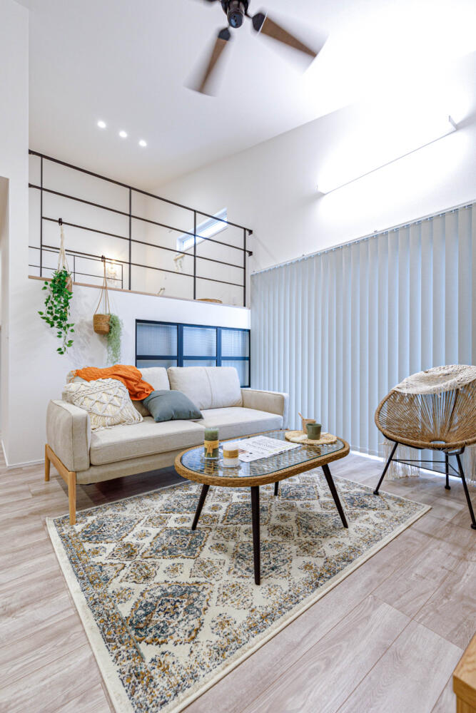 21帖のLDKは吹抜けがあり明るく解放感のある空間になっています。中2階はタタミになっているのでゴロンと寛ぐこともできます。