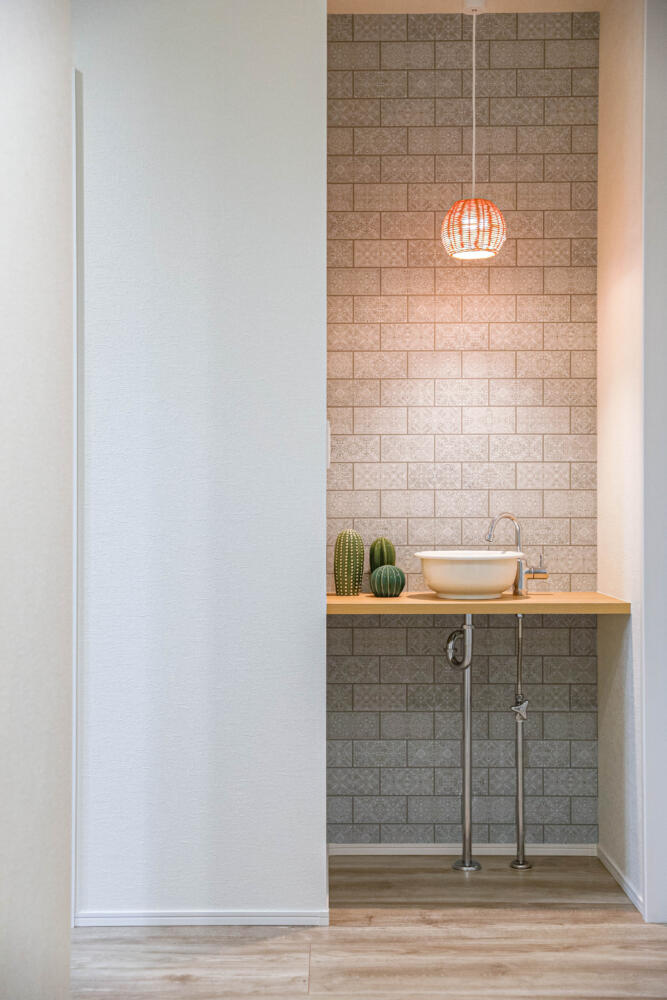 家族専用の収納&出入口のある玄関スペース。帰ってきてすぐに手を洗える手洗いスペースは衛生的なだけでなく、インテリアにもこだわりました。