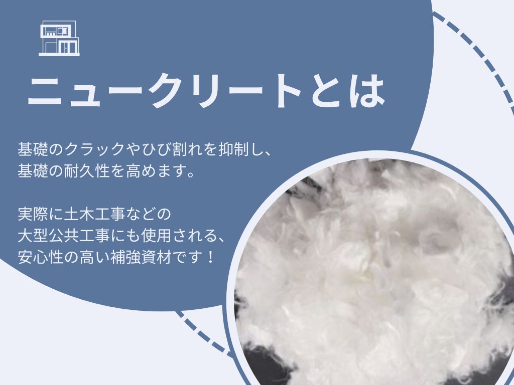 住宅コンクリート基礎の補強材として「ニュークリート」。基礎コンクリートのひび割れ防止や、コンクリートの中性化を抑止し、鉄筋の腐食を防ぐなど基礎の劣化を防ぎます。