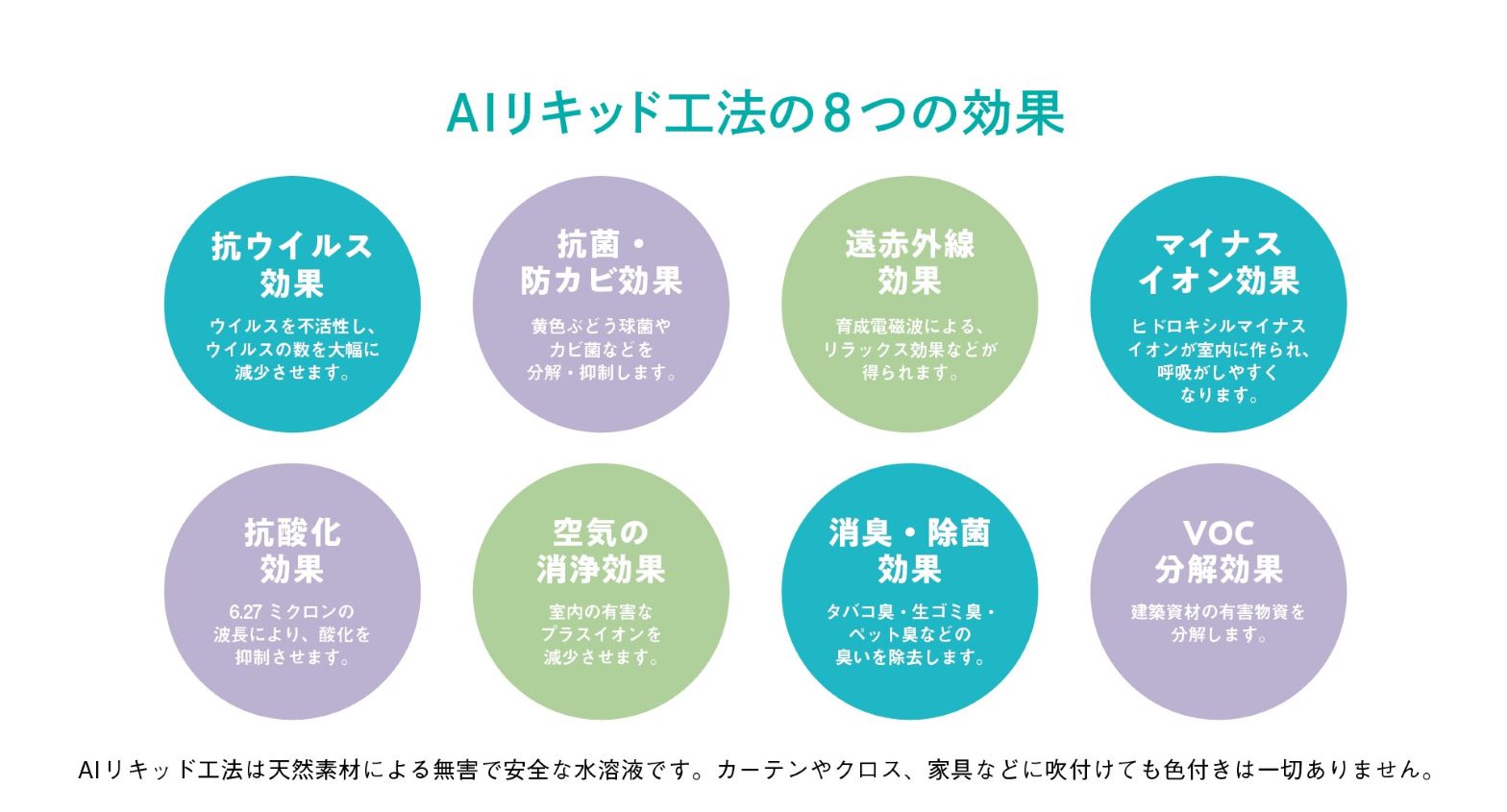 室内をマイナスイオンで満たす「AIリキッド工法」。100%天然素材の水溶液が有害物質を分解し、澄んだ空気の安全な住環境を作ります。深呼吸したくなる住まいへ。
