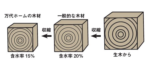 含水率を平均15%まで低減し、木の収縮や膨張を抑制。木やせや変形を防ぐことで、住まいの骨組みをいつまでも頑強に保ちます。目に見えない部分から家族の安心を支え続ける、高耐久な住まいです。