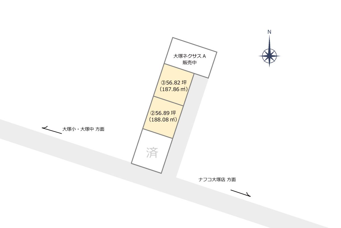 | 販売価格 | 《1号地》 ご成約済み 《2号地》 1,500万円(188.08㎡/56.89坪) 《3号地》 1,500万円(187.86㎡/56.82坪) 《4号地》 大塚ネクサスA号館【販売中】 |