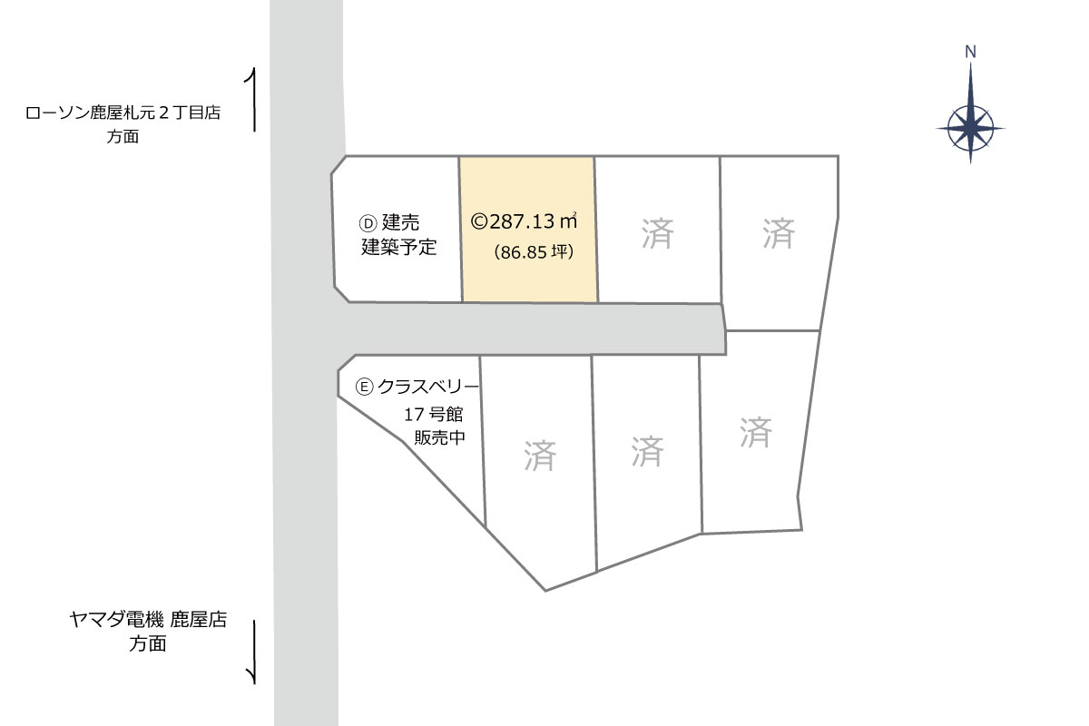 | 販売価格 | 《A号地》ご成約済み 《B号地》ご成約済み 《C号地》530万円(287.13㎡/86.85坪) 《D号地》建売建築予定 《E号地》クラスベリー17号館【平屋】販売中 |