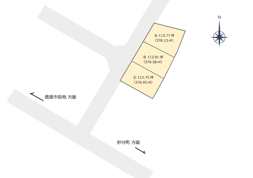 | 販売価格 | 《A号地》380万円(376.13㎡/113.77坪) 《B号地》380万円(376.58㎡/113.91坪) 《C号地》500万円(376.05㎡/113.75坪) ※各区画建築条件無しです。 |