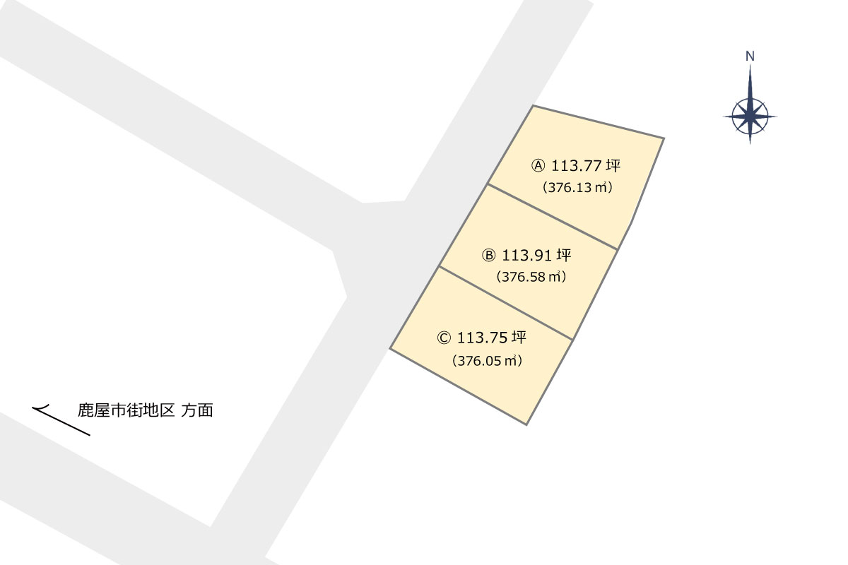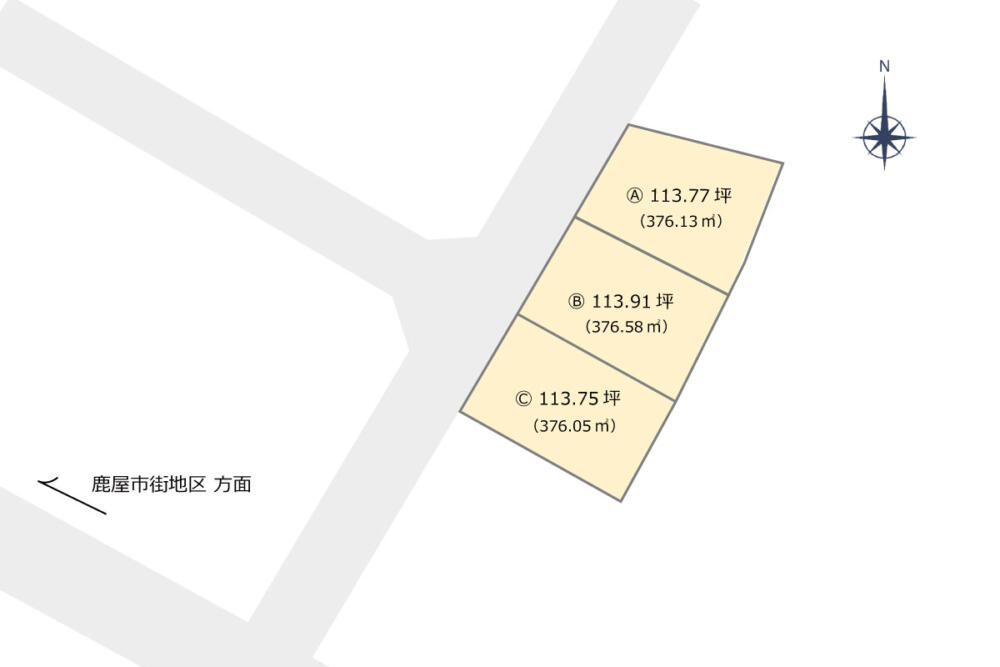 | 販売価格 | 《A号地》380万円(376.13㎡/113.77坪) 《B号地》380万円(376.58㎡/113.97坪) 《C号地》500万円(376.05㎡/113.75坪) ※各区画建築条件無しです。 |