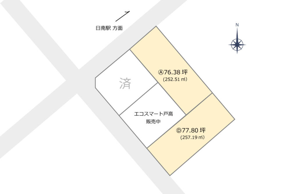 | 販売価格 | 《A号地》 770万円(252.51㎡/76.38坪) 《B号地》 ご契約済み 《C号地》 エコスマート戸高【平屋】販売中 《D号地》 780万円(257.19㎡/77.80坪) |