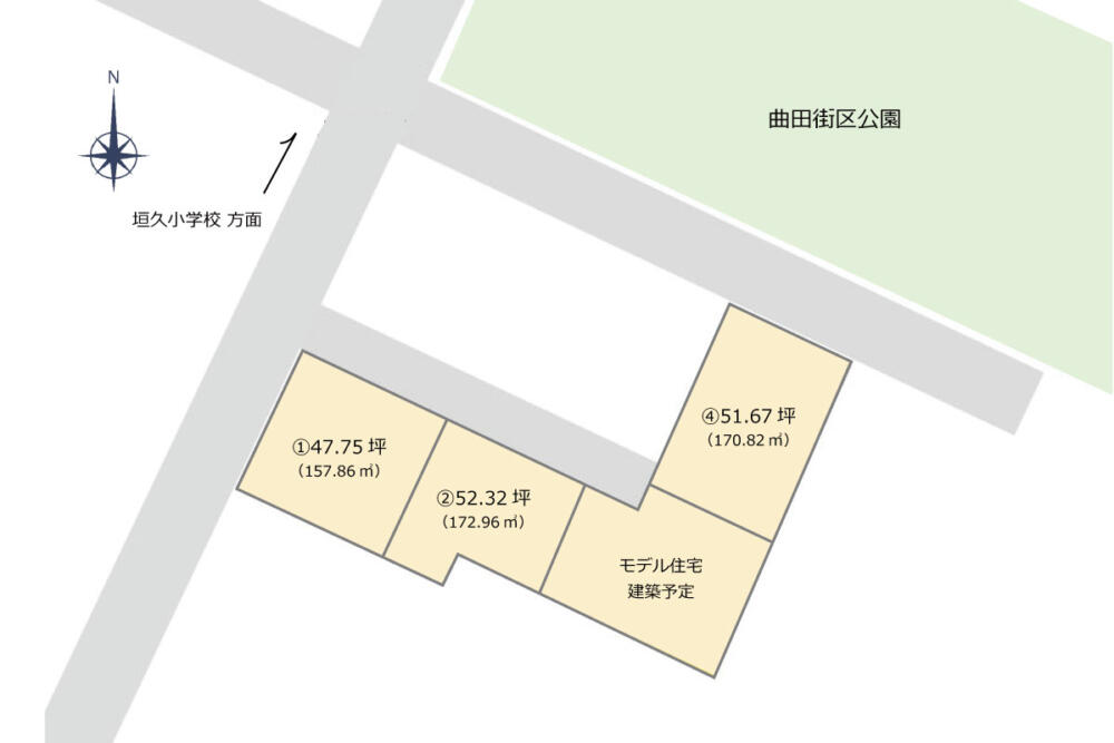 | 販売価格 | 《1号地》 1,450万円(157.86㎡/47.75坪) 《2号地》 1,450万円(172.96㎡/52.32坪) 《3号地》 モデルハウス建築予定 《4号地》 1,500万円(170.82㎡/51.67坪) |