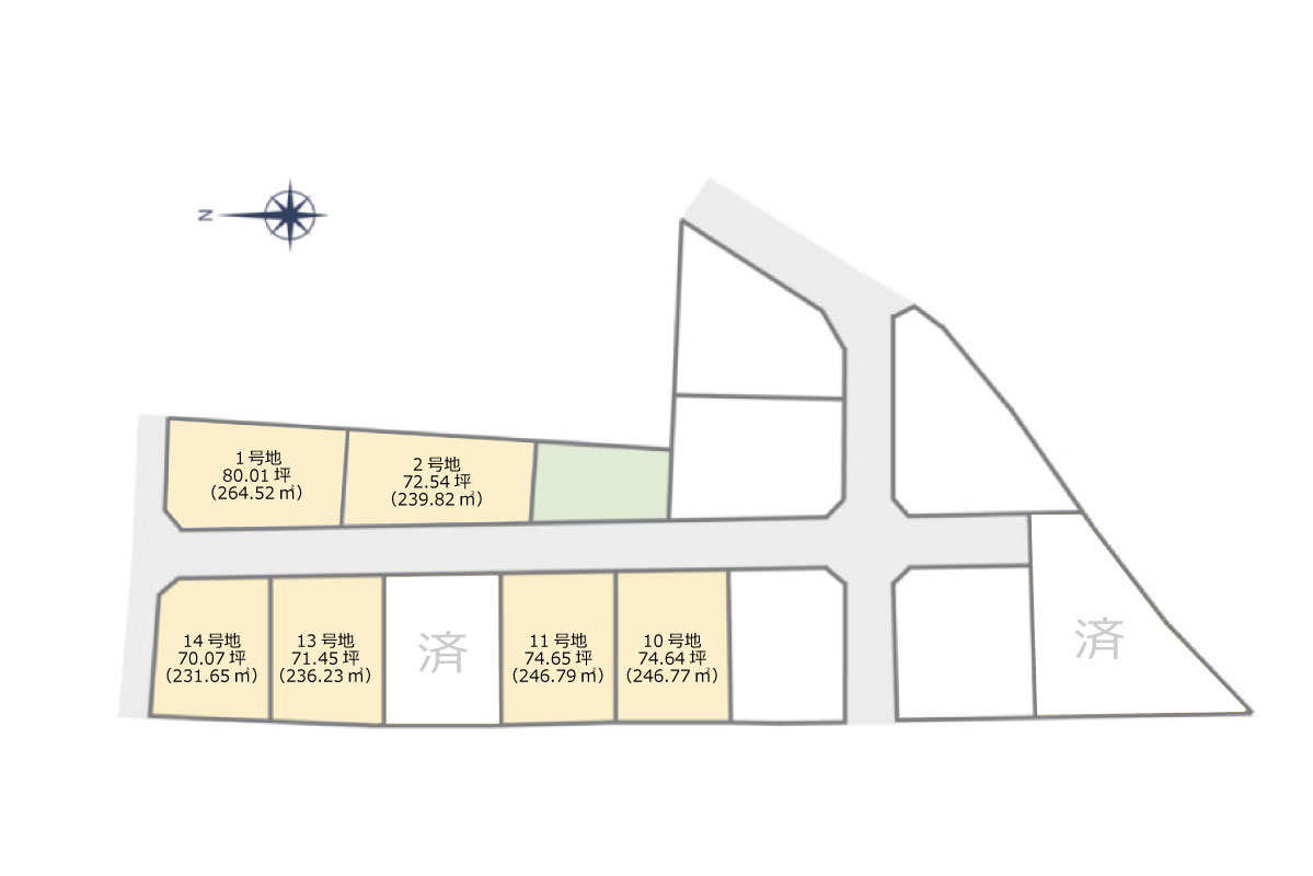 | 販売価格 | 《1号地》 644万円 (264.52㎡/80.01坪) 《2号地》 635万円 (239.82㎡/72.54坪) 《10号地》 600万円 (246.77㎡/74.64坪) 《11号地》 600万円 (246.79㎡/74.65坪) 《13号地》 582万円 (236.23㎡/71.45坪) 《14号地》 571万円 (231.65㎡/70.07坪) ※10〜13号地は平屋条件付きです。 |