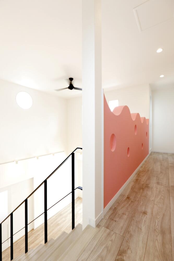 波うつ腰壁の丸開口からのぞきたい大空間吹き抜け