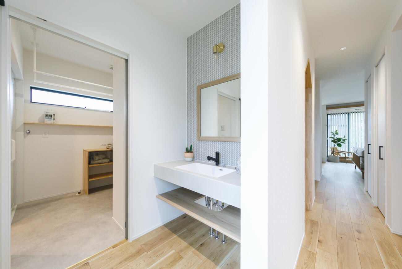洗面を軸に水まわりを回遊できる設計で、