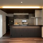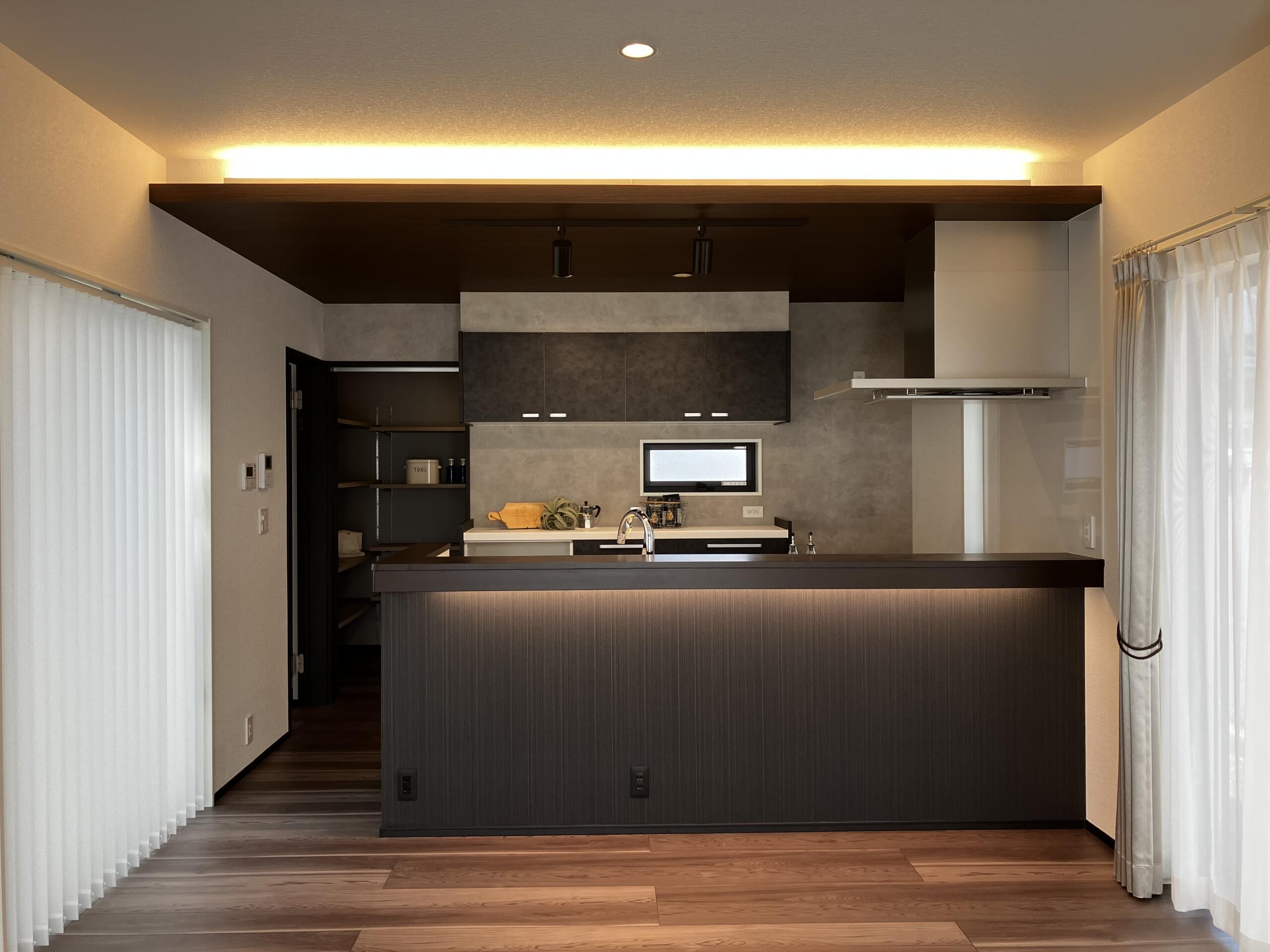 ホテルライクなキッチンスペース。奥にはパントリーも設計。