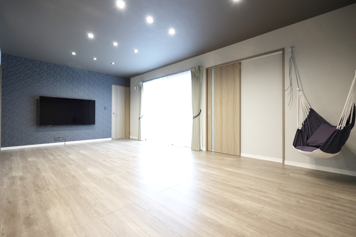 L字型の広々リビング。リビング角にハンモックがあり、最高の憩いのスペース。