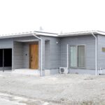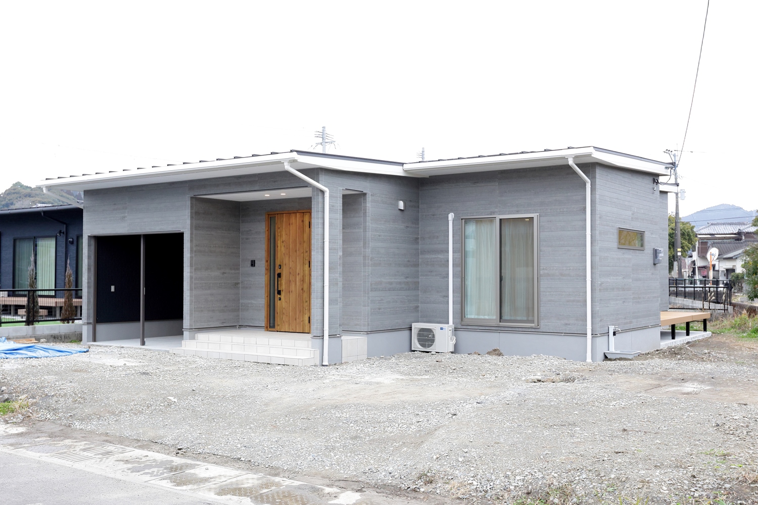 流行りのインナーガレージ+グレーの外観。将来のメンテナンスも考えてニチハのFu-geを採用。