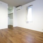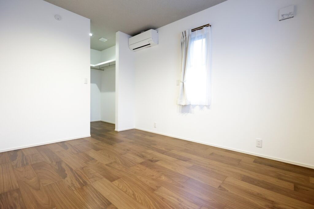 一部床の色合いを暗くしたウォークインクローゼット付きの寝室。