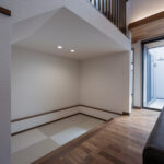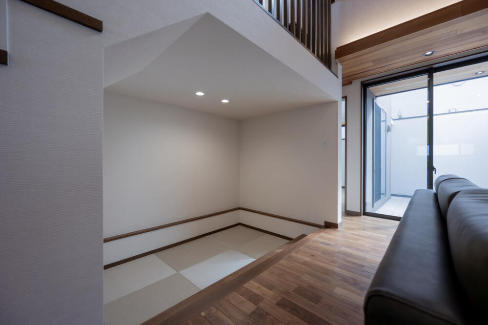 中二階の下の掘り下げたタタミ、程よく囲われて過ごしやすい。