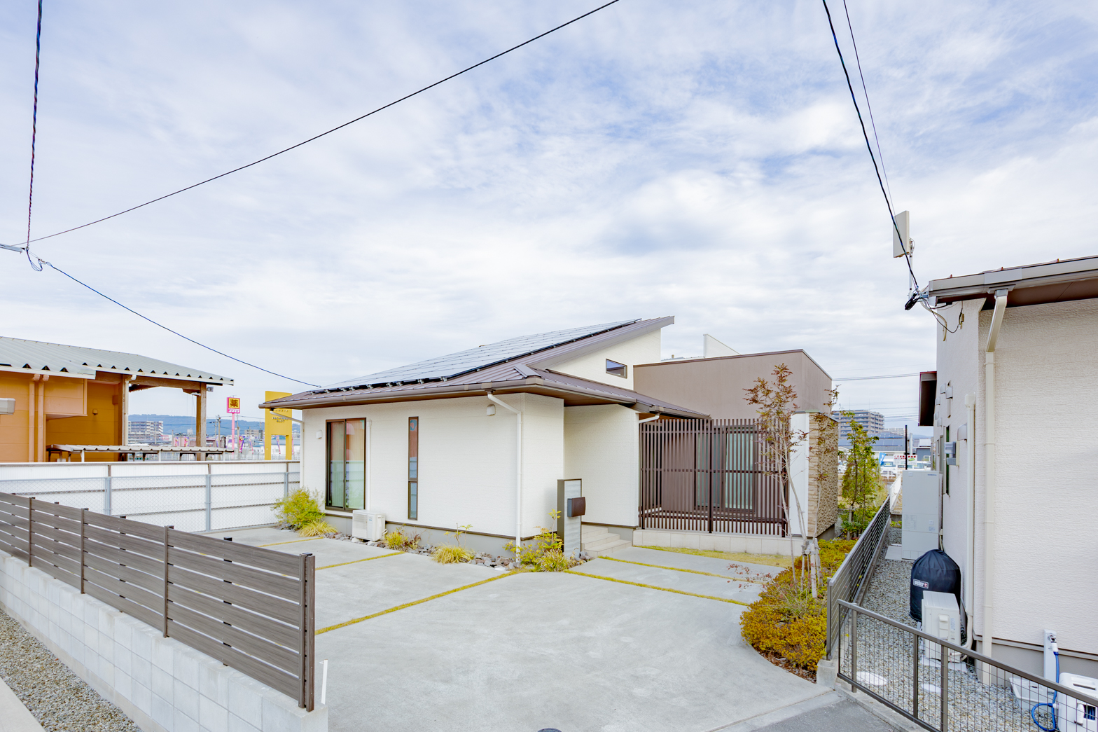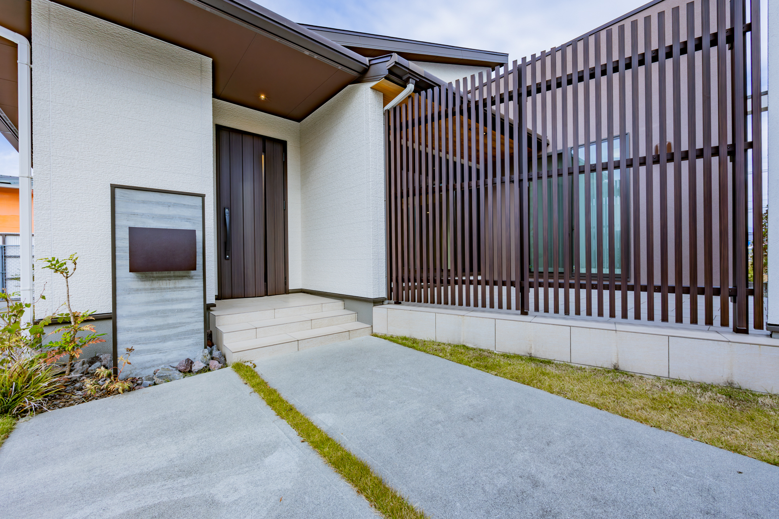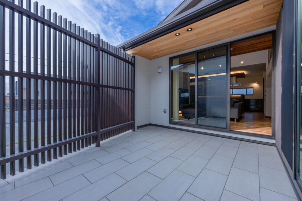 リビング横に広々使えるテラス。軒天井と柵が綺麗に映えます。