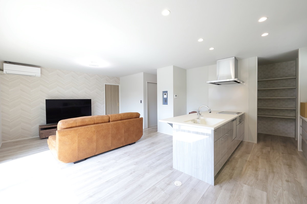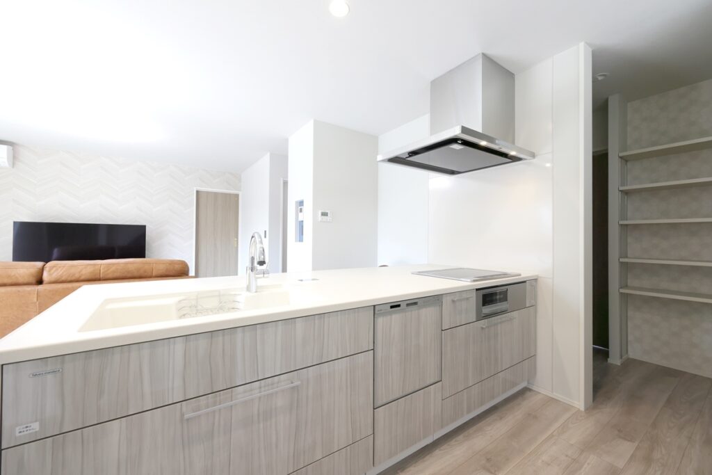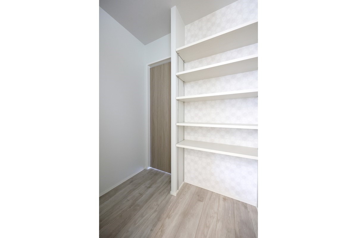 キッチン横のパントリーは玄関にもつながっており、使い勝手のよい動線になっています。