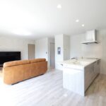 キッチンと横並びになるダイニング。どの位置からでもテレビが見れる配置。