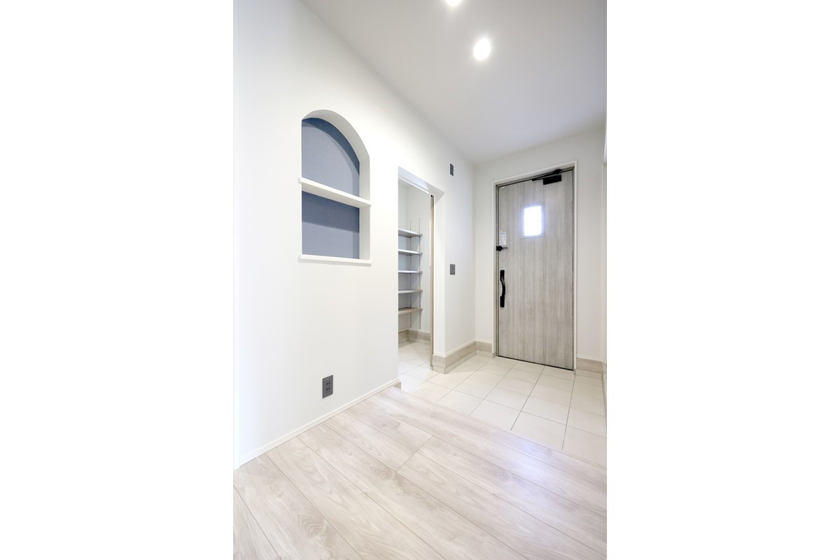 玄関はパントリーとつながり、収納量抜群のシューズクロークもあり、充実した広さになっています。
