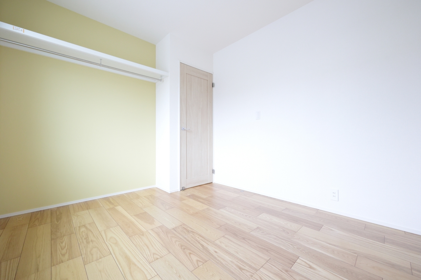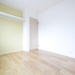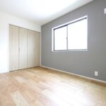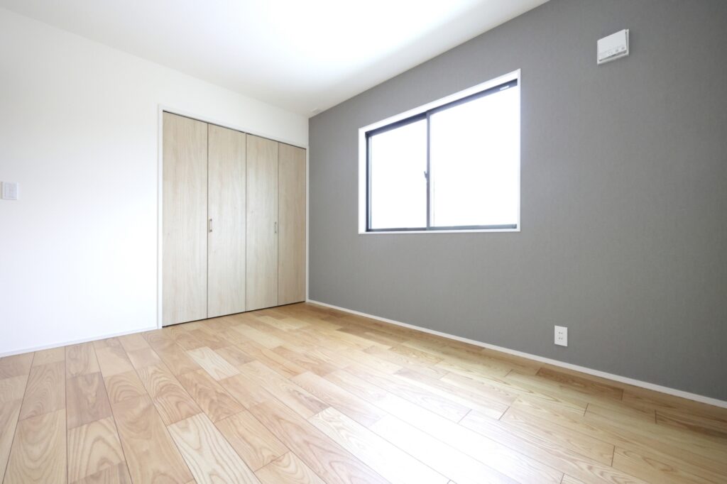 グレー系色のクロスを採用され落ち着いた色合いの寝室。