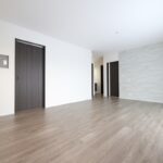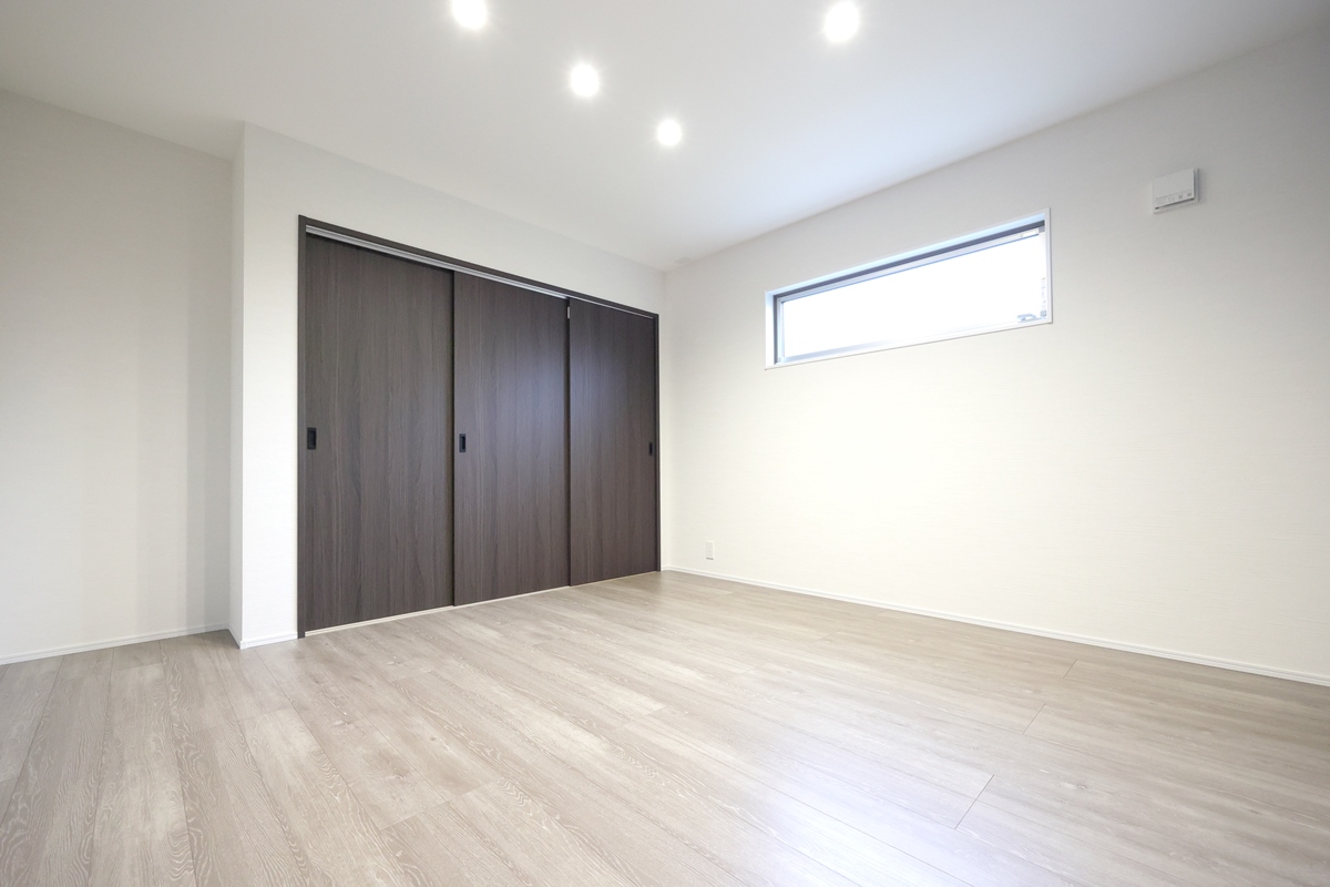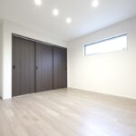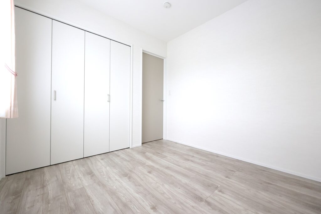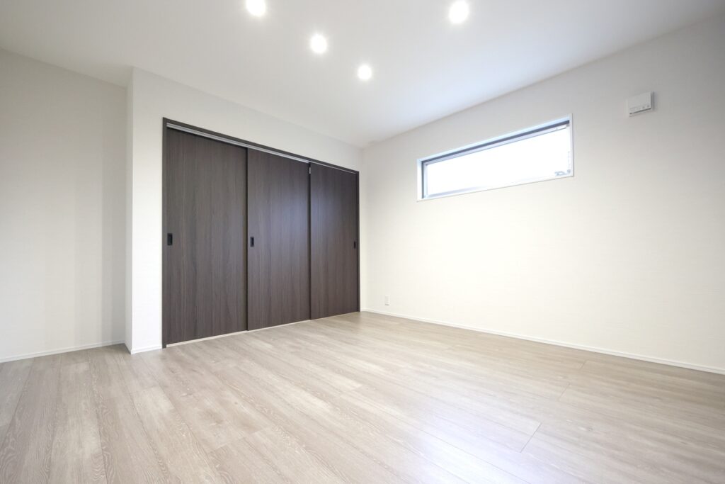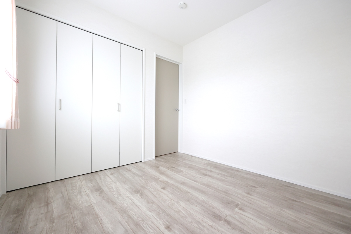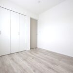 寝室は約7帖+1.5帖の収納付き。落ち着いた色合いのクロスでゆっくり休めそうです。
