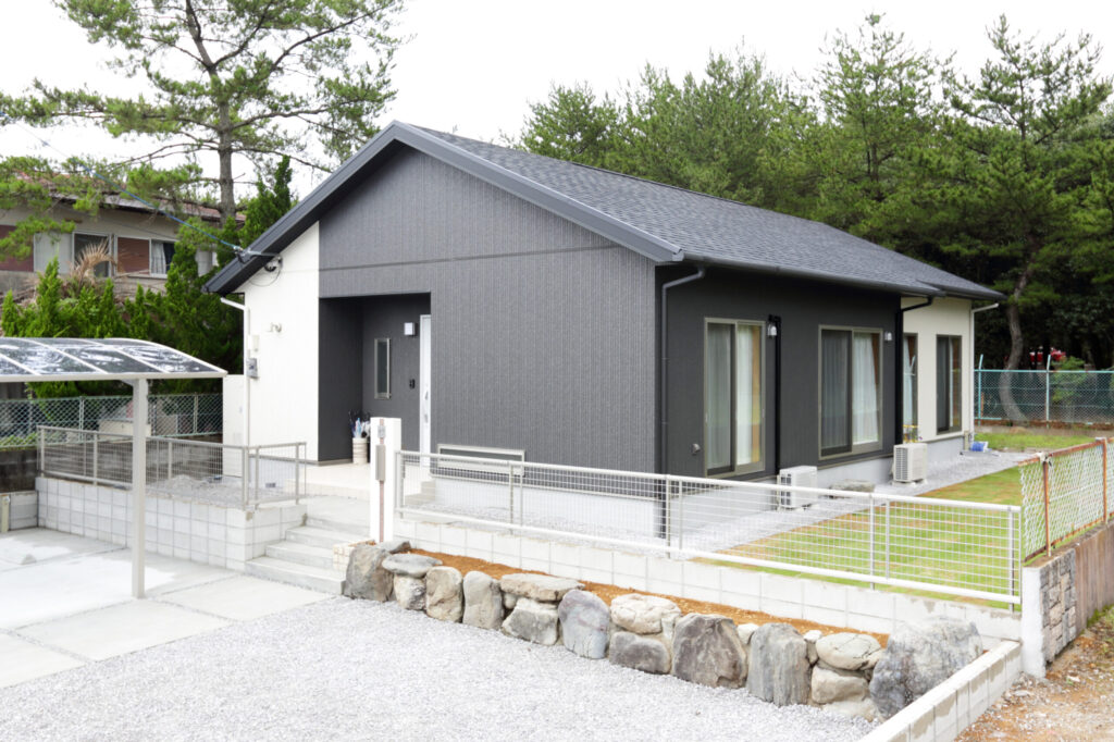 黒の外壁と飛び石と竹の似合うオシャレな外観に